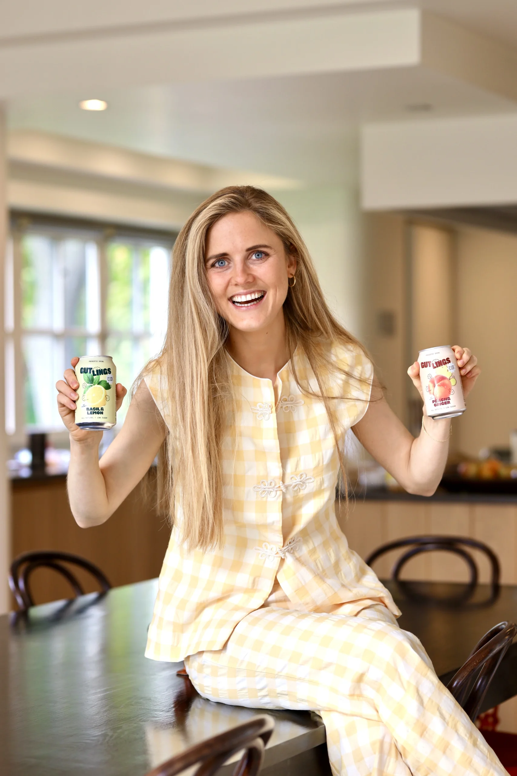 Hand placing a GutLings Basil & Lemon can on a restaurant table next to a drink and food, photographed for a GutLings campaign by Refined Studios.